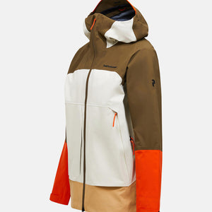 Adjustable drawcord at bottom hem, Adjustable sleeve hem with velcro straps, Articulated sleeves, Exposed zippers are YKK AquaGuard®, Fixed Hood, Full front, 2-way YKK AquaGuard® zipper, Fully seam sealed, GORE-TEX 3L C-KNIT™, Hanger loop inside neck, Hidden RFID pass pocket, Inner mesh pocket accessible through ventilation, Laminated brim, Leg pocket with flap, Made without intentionally added PFAS, P-logo rubber badge at sleeve, Packable into hood, Peak Performance embroidery at chest, Plastic wire at hood brim, RECCO® Rescue System reflector, RECCO® Technology, Ski helmet compatible hood, Soft fleece lined chin protection, Two-way (height and width) adjustable hood, Zippered bellow waist pocket, Zippered front facing ventilations, Zippered inner pocket