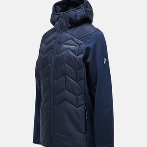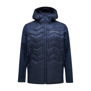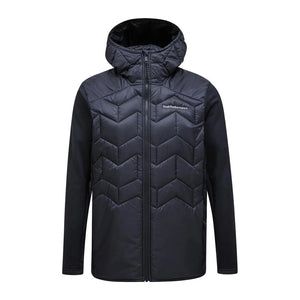 Body - 133 gr/m2, Chinguard, Elastic binding at bottom hem, Fixed Hood, Full front with reversed YKK coil zipper, Hanger loop at back, Hood - 60 gr/m2, Hybrid, Jersey panels, Lightweight recycled polyester ripstop, wind and water resistant, Made without intentionally added PFAS, One-way (width) adjustable hood, P-logo embroidery at sleeve, Peak Performance embroidery at chest, Quilted in P-logo pattern, Recycled fibers, Recycled insulation, Repair patch included, Sleeve hems with thumbhole, Synthetic sheet insulation., Zippered hand pockets