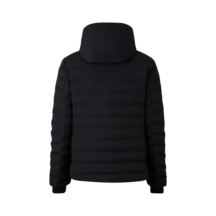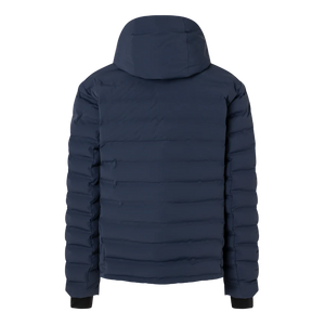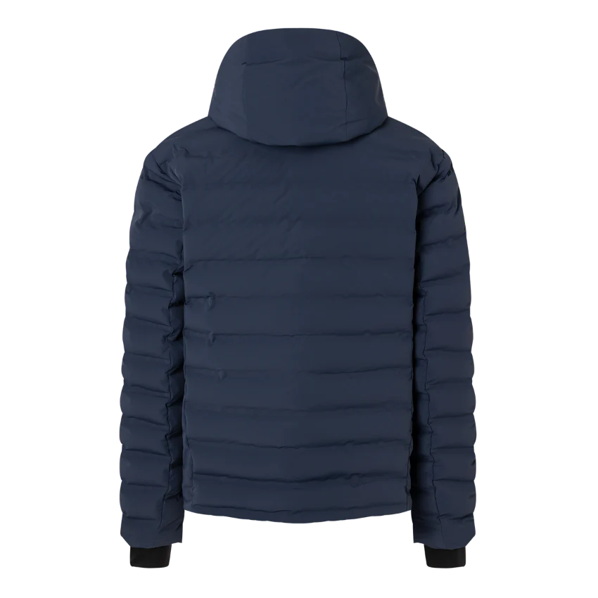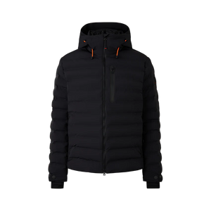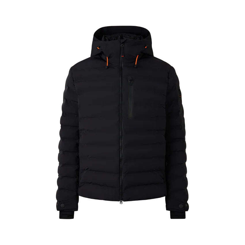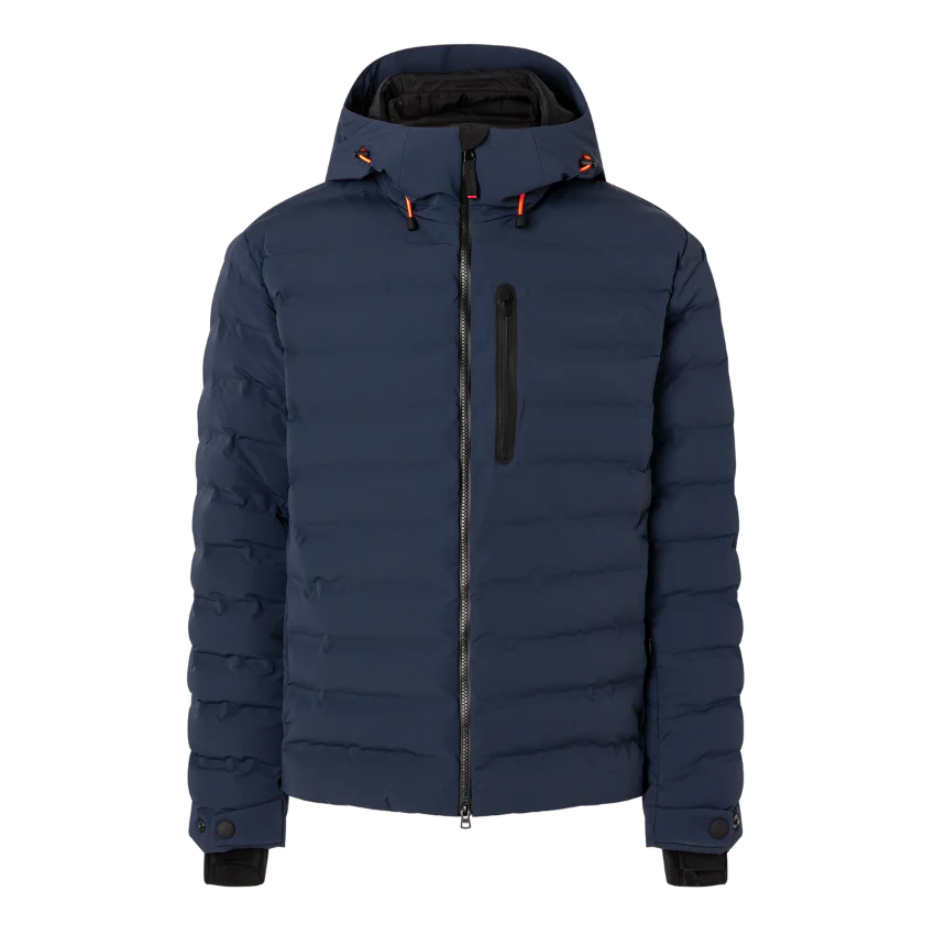 Regular fit quilted ski jacket featuring padded stand-up collar, fixed hood with drawstring and stoppers, long sleeves, cuffs with snap fasteners and inside thumb loop, two-way zip with B pendant, underlaid with FIRE+ICE trim, one zip-up ski pass pocket on the